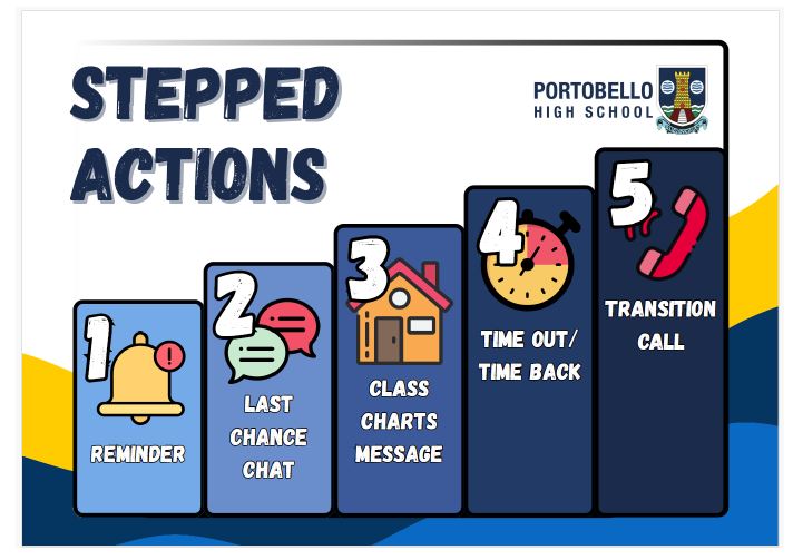At each point within the Stepped Actions, our aim will be to get the young person back to their learning as quickly as possible. We are also using the Stepped Actions to notify parents/carers, in a consistent way, when behaviour escalates beyond a “Last Chance Chat”. We believe that working in close partnership with our families is essential in supporting and encouraging the best from our learners and we thank you in advance for your support.